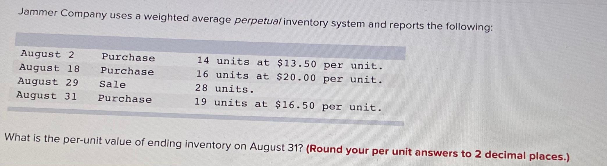 August 18 Purchase 9 units at 1300 per unit. Jammer Company uses a weighted average perpetual inventory system and reports the following. August 31 Purchase 12 units at 1300 per unit.