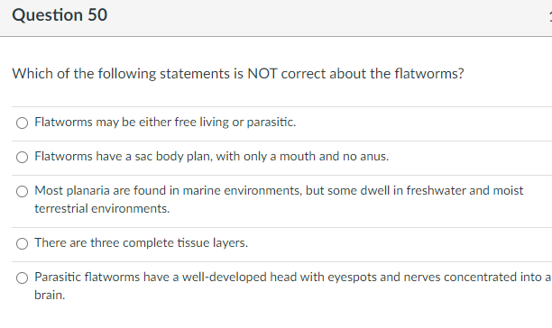Question 50 122 122 points Which of the following is not a reason why flatworms from BIOL 1409 at Lone Star College System. Which of the following are characters present in platyhelminthes. It contains three types of muscle tissue.
